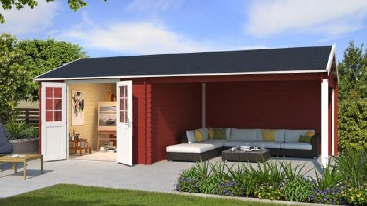 EL PASO Gartenhütte mit Überdachung. Ein wunderschönes Gartenhaus mit großzügiger überdachter Terrasse. Mit einer Wandstärke von 28 mm eignet es sich hervorragend als klassisches Gerätehaus oder als gemütlicher Pavillon für Familie und Freunde im Sommer. Die Hütte bietet 11,4 m² Innenraum und 14,4 m² überdachte Terrasse.