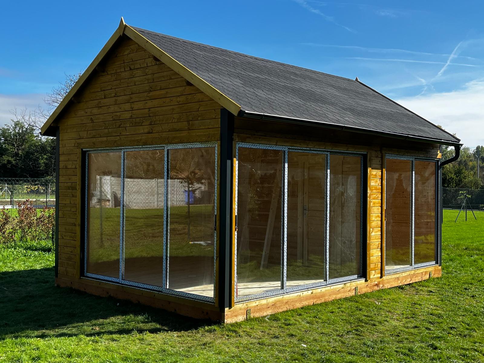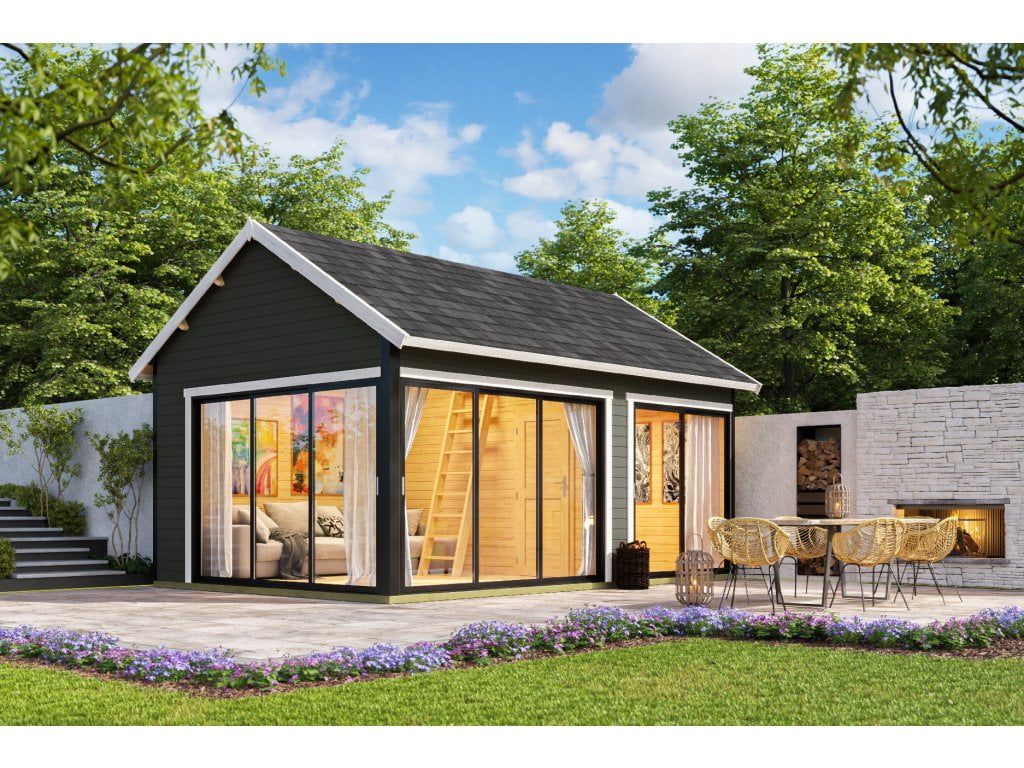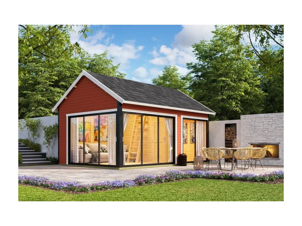 Freizeitchalet oder auch Atelier Murano 3 mit einer Wandstärke von 44 mm. Murano vereint die Eleganz traditioneller Elemente mit modernem Design. Das klassische Satteldach in Kombination mit Aluminiumrahmen-Schiebetüren verleiht dem Haus einen charakteristischen Look, der gleichzeitig Gemütlichkeit und Komfort ausstrahlt. Dank der doppelt verglasten, dreiteiligen und einer einteiligen Schiebetür mit Sicherheits-Isolierglas ist der Innenraum des Ateliers lichtdurchflutet und hell.