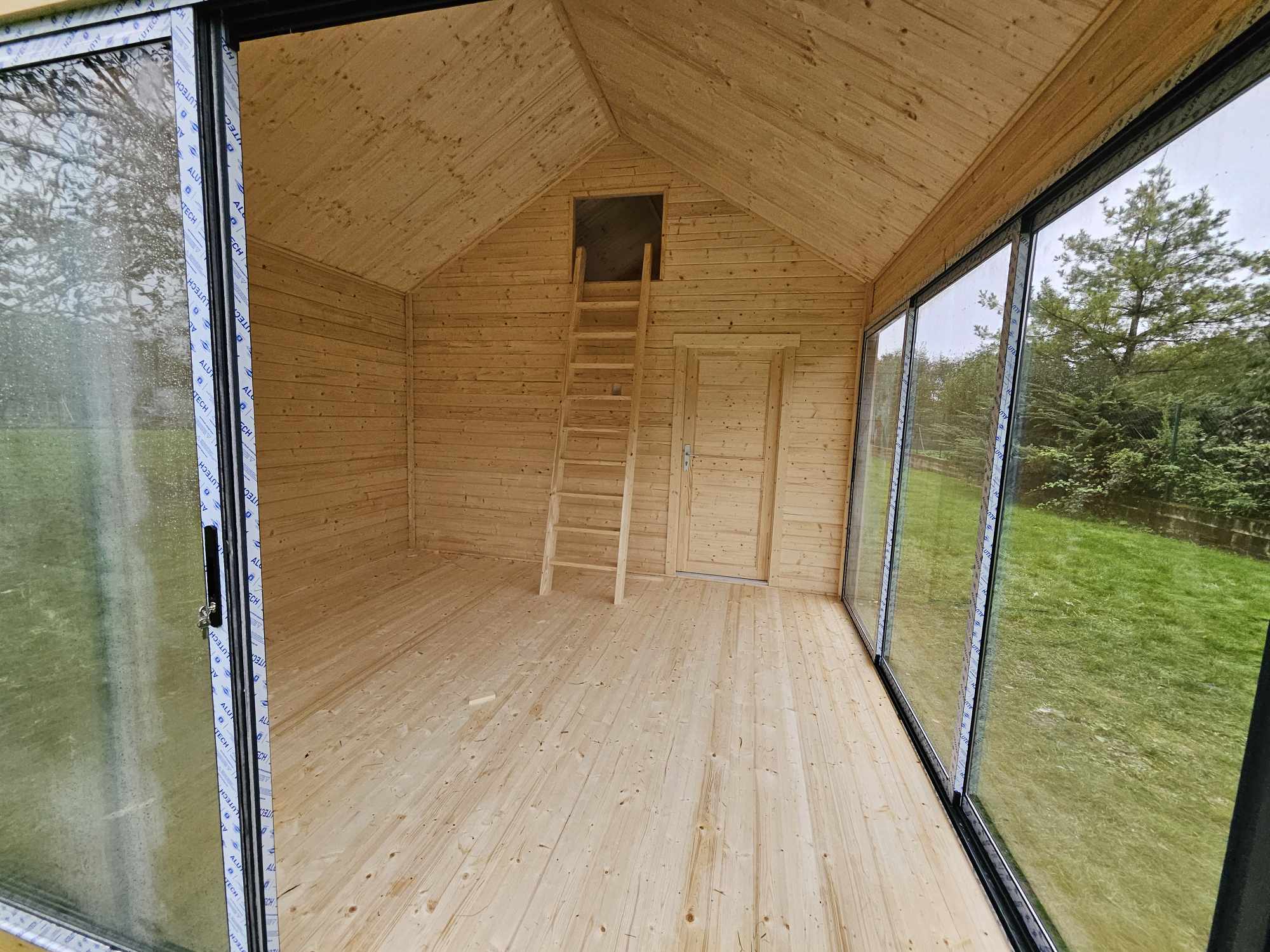 Zwei geräumige Zimmer mit hoher Decke bieten ausreichend Platz für Ihre Aktivitäten und zur Erholung. Ein besonderer Mehrwert dieses Hauses ist das Schlafgeschoss, das über eine Leiter erreichbar ist – ein gemütlicher Rückzugsort zum Träumen, Ausruhen oder Entspannen in diesem Gartenatelier.