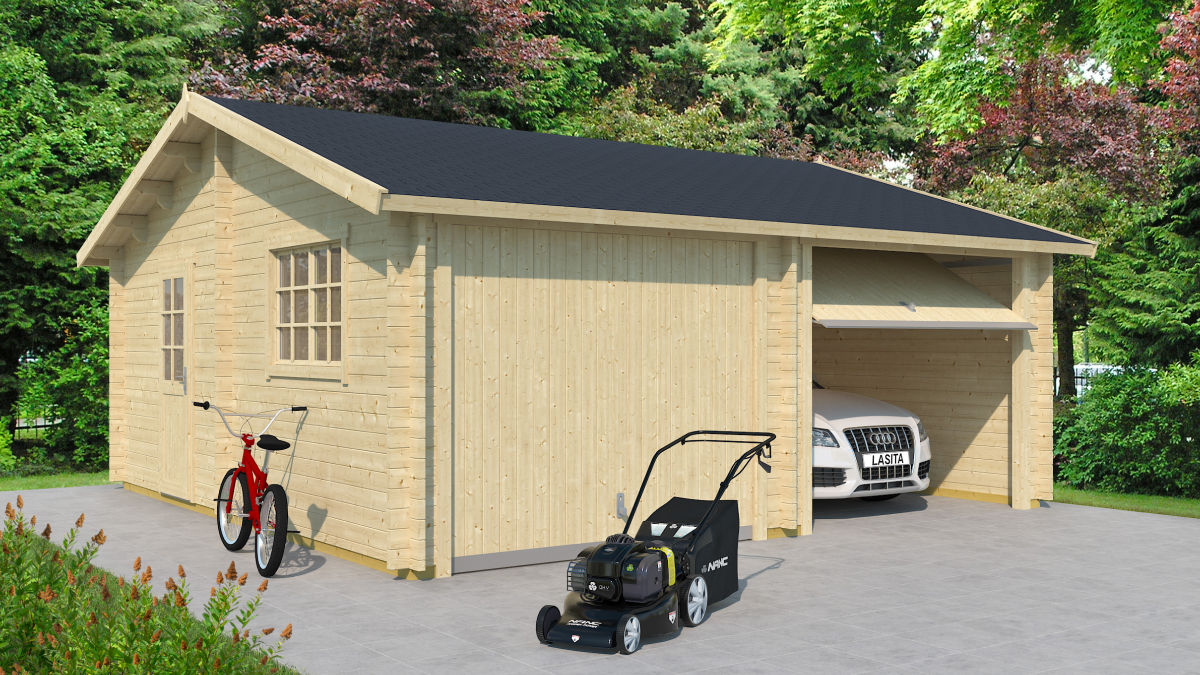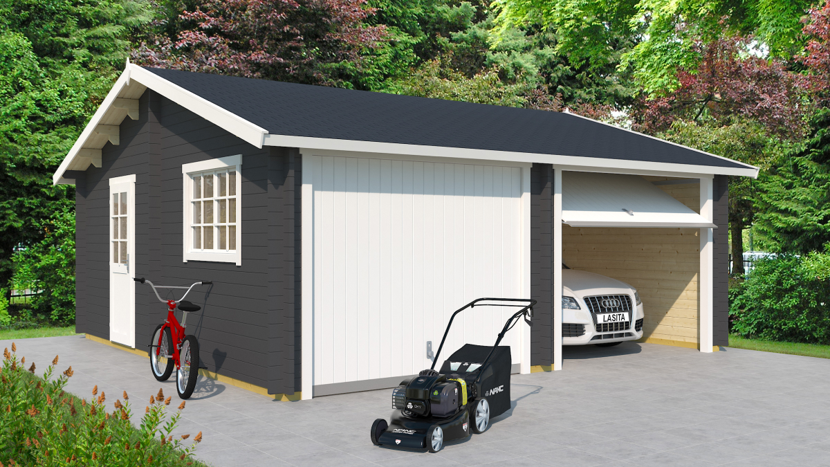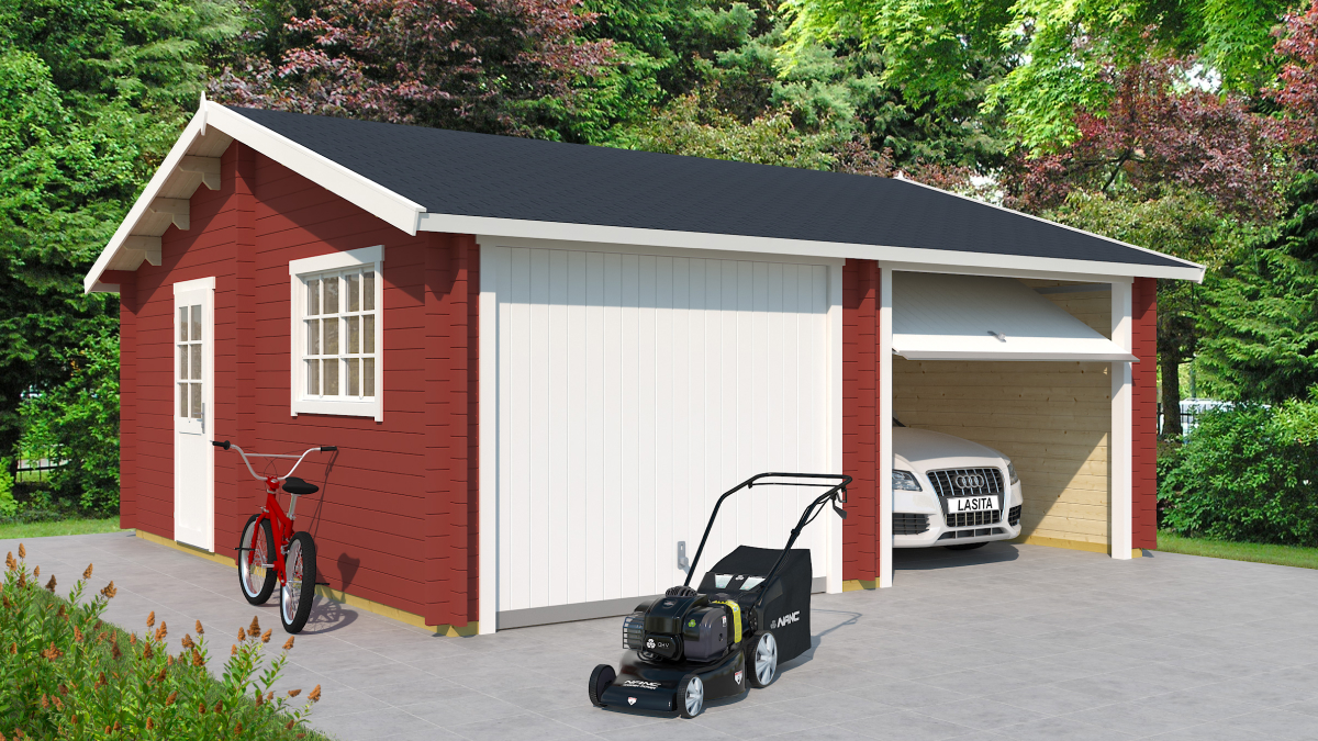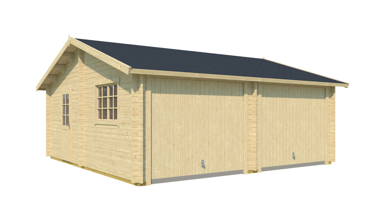 Die vormontierte Doppelgarage wird aus vorgetrocknetem nordischem Fichtenholz gefertigt. Im Lieferumfang enthalten sind ein Fenster, eine Tür, Beschläge, 2x zweiflügelige Garagentore sowie ein Schloss mit Schlüssel. Ein Schwingtor ist gegen Aufpreis erhältlich.