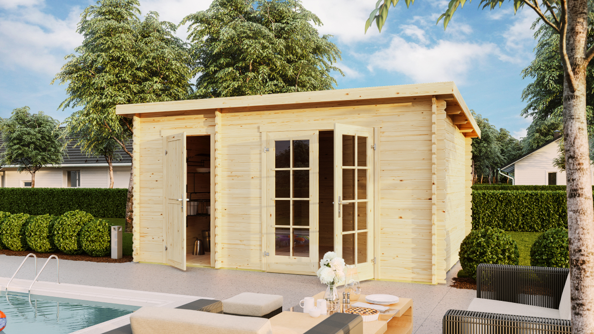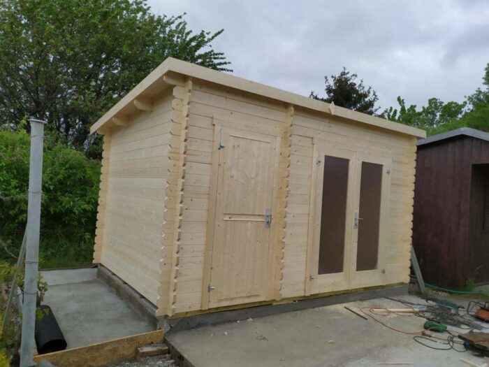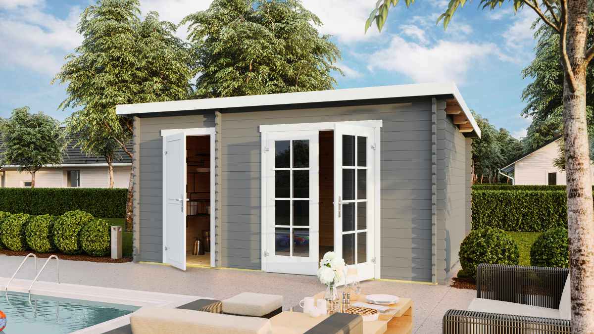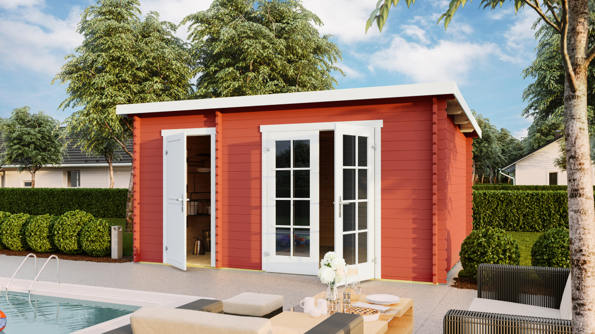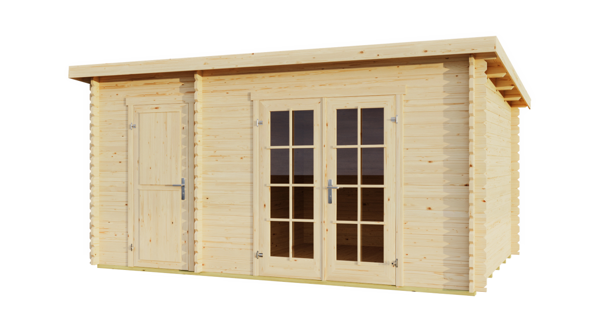 Gartenhäuser mit Pultdach Belmont 1 und 2. Zwei Größen dieses Gartenhauses, das in einen Wohn- und einen Nutzbereich unterteilt ist. Wunderschöne Doppeltüren mit Sicherheits-Plexiglas, die diesem hochwertigen Häuschen aus Estland von Lasita noch mehr Charme und Attraktivität verleihen. Gartenhäuser mit Pultdach sind in zwei Varianten erhältlich. Das kleinere Häuschen misst 3,8×2,5 m. Das größere hat die Maße 4,25×2,85 m. Das Gartenhaus kann auch spiegelverkehrt montiert werden. Der Boden besteht aus 17 mm Nut-und-Feder-Brettern (wie bei den meisten unserer Häuschen).