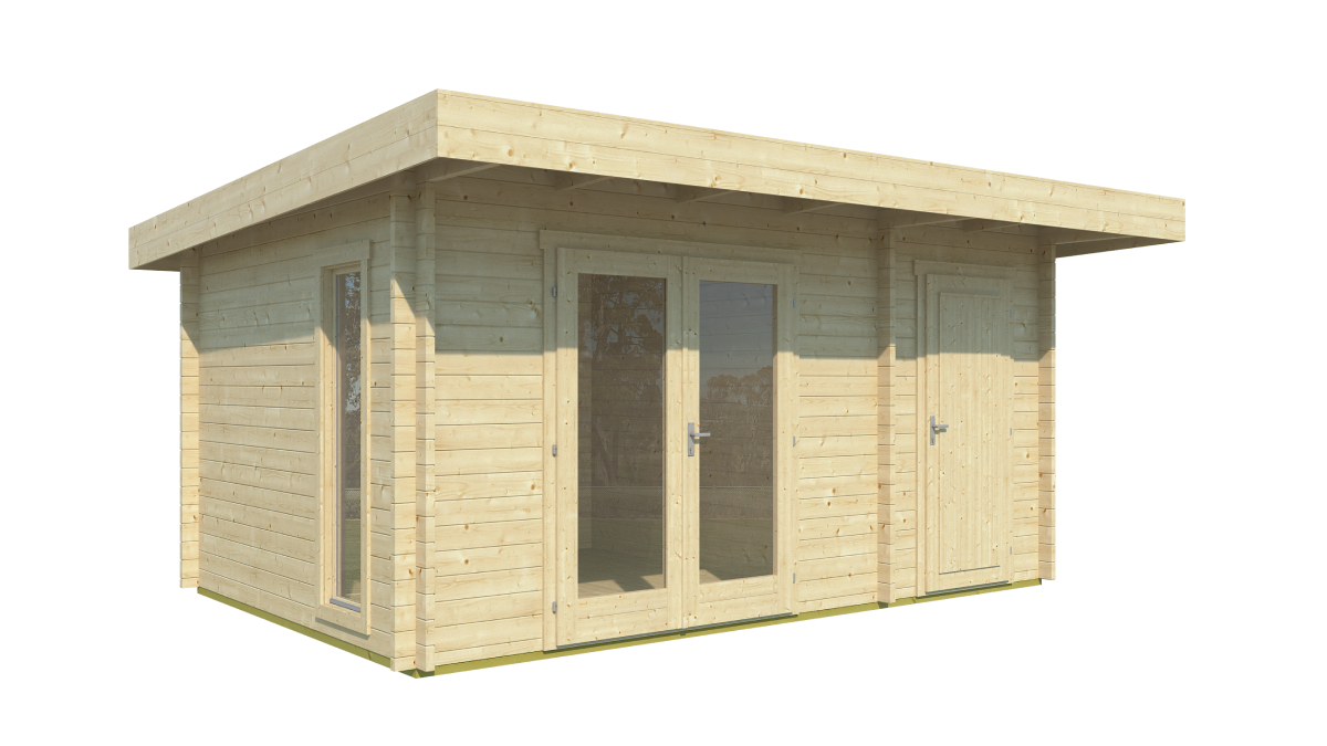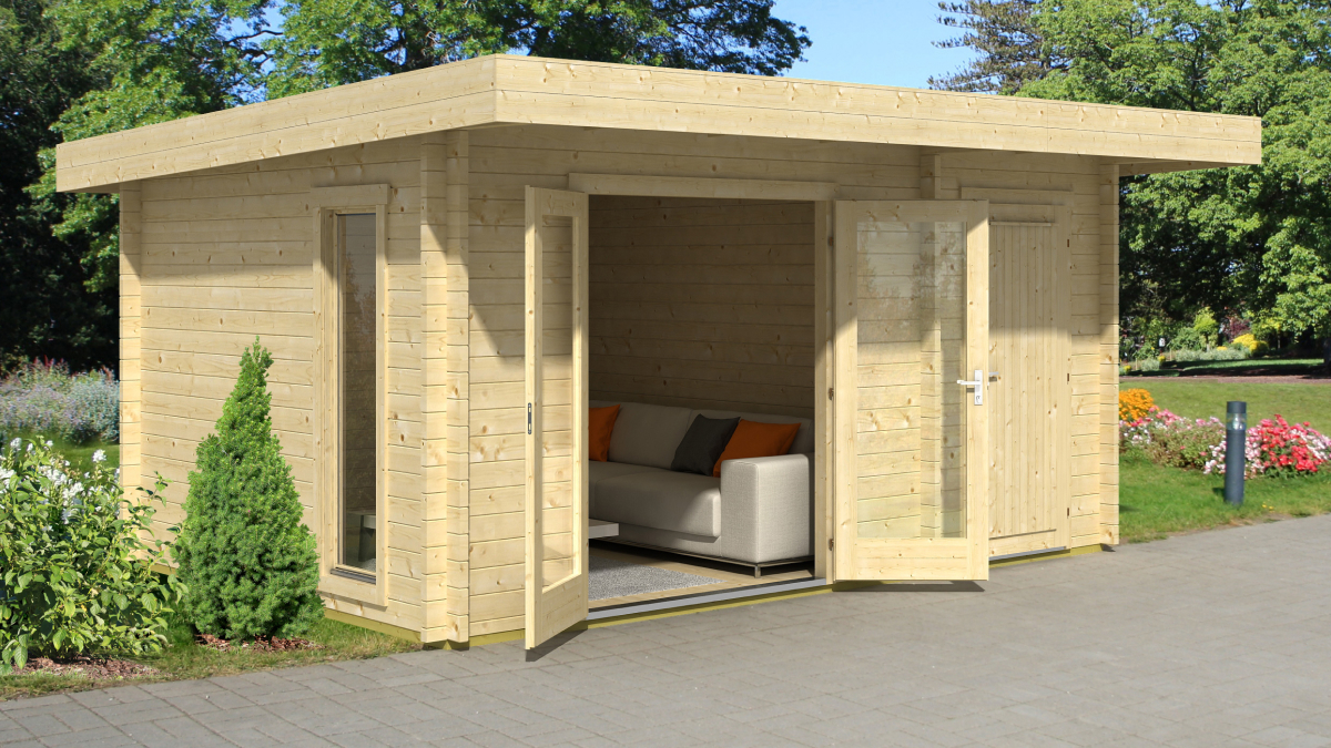 Gartenhaus Chameleon 44 ist ein größeres elegantes Gartenhaus, das in einen Nutzraum und einen Gesellschaftsraum unterteilt ist und mit einem Flachdach versehen ist. Das Haus wird mit Fenstern und Türen mit Isolierverglasung geliefert. Es bietet eine einfache und schöne Lösung, die eine Kombination aus einem praktischen Gartenhaus und einem Schuppen darstellt, das perfekt zu Ihrem Familienhaus passt. Gartenhaus Chameleon bietet insgesamt etwa 13 m² Innenbodenfläche. Es kann als Lagerraum für Gartenmaterialien und als Sommerküche genutzt werden. Es kann auf Pflastersteinen, einer Betonplatte oder auch auf einem Holzrost und Erdschrauben aufgebaut werden. Der Prozess ist in der Sektion technische Informationen und im Blog zu finden. Das Gartenhaus Chameleon wird aus vorgetrocknetem nordischen Fichtenholz gefertigt. Das Haus umfasst Fenster, Doppeltüren, Beschläge, Boden, Schloss mit Schlüssel.
