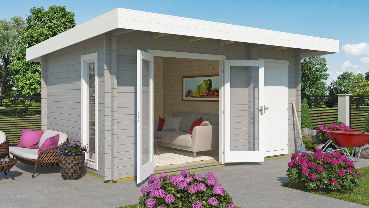 Was denken Sie über dieses Gartenhaus? Es ist wunderschön. Aruba ist ein modernes Gartenhaus mit einem wirklich perfekten Walmdach.