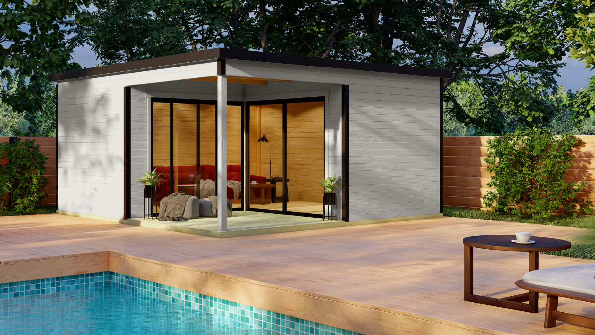 Eine weitere Variante eines modernen und luxuriösen Gartenhauses für anspruchsvolle Kunden. Das Haus verfügt über Fenster und Türen aus Aluminiumprofilen, die höchsten Qualitätsstandards entsprechen. Die Häuser gehören zur Serie CUBE, die den modernen Architekturtrend bei Gartenbauten widerspiegelt.