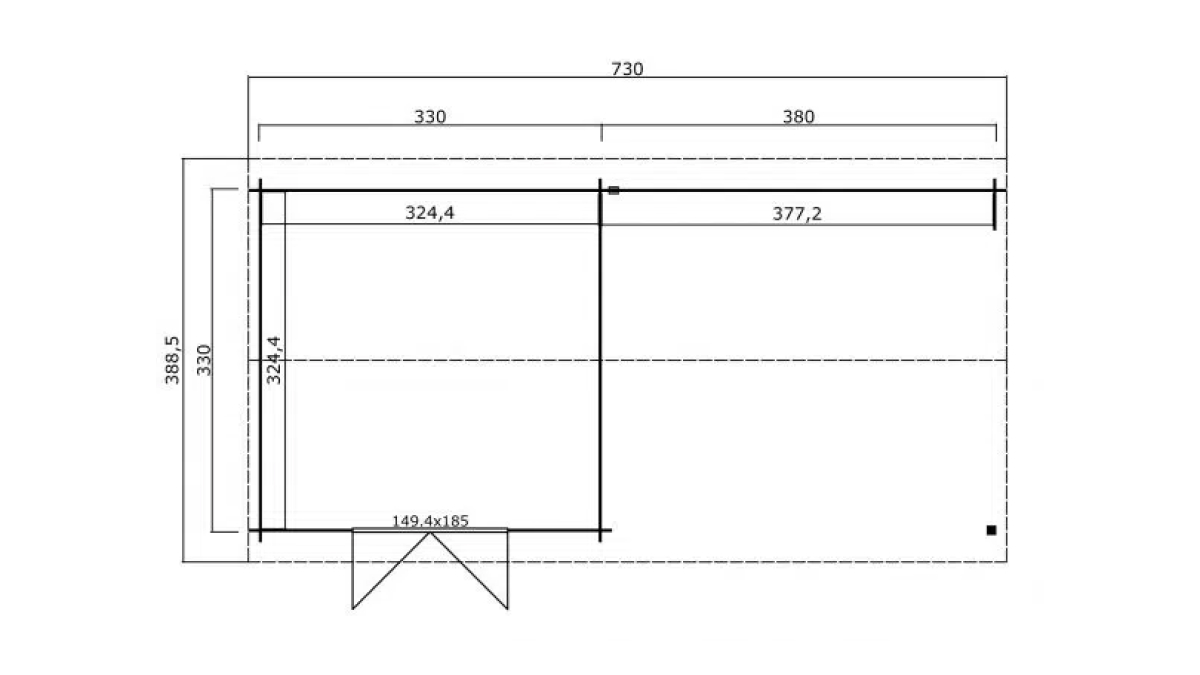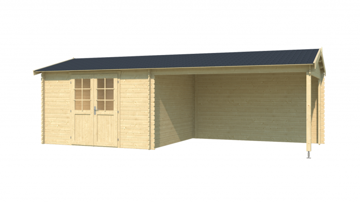Zum Gartenhaus kann ein Anbau bestellt werden, der das Dach seitlich um 120 cm verlängert (auf Wunsch auch maßgefertigt). Den Anbau und die Terrasse können Sie in unseren Realisierungen sehen.