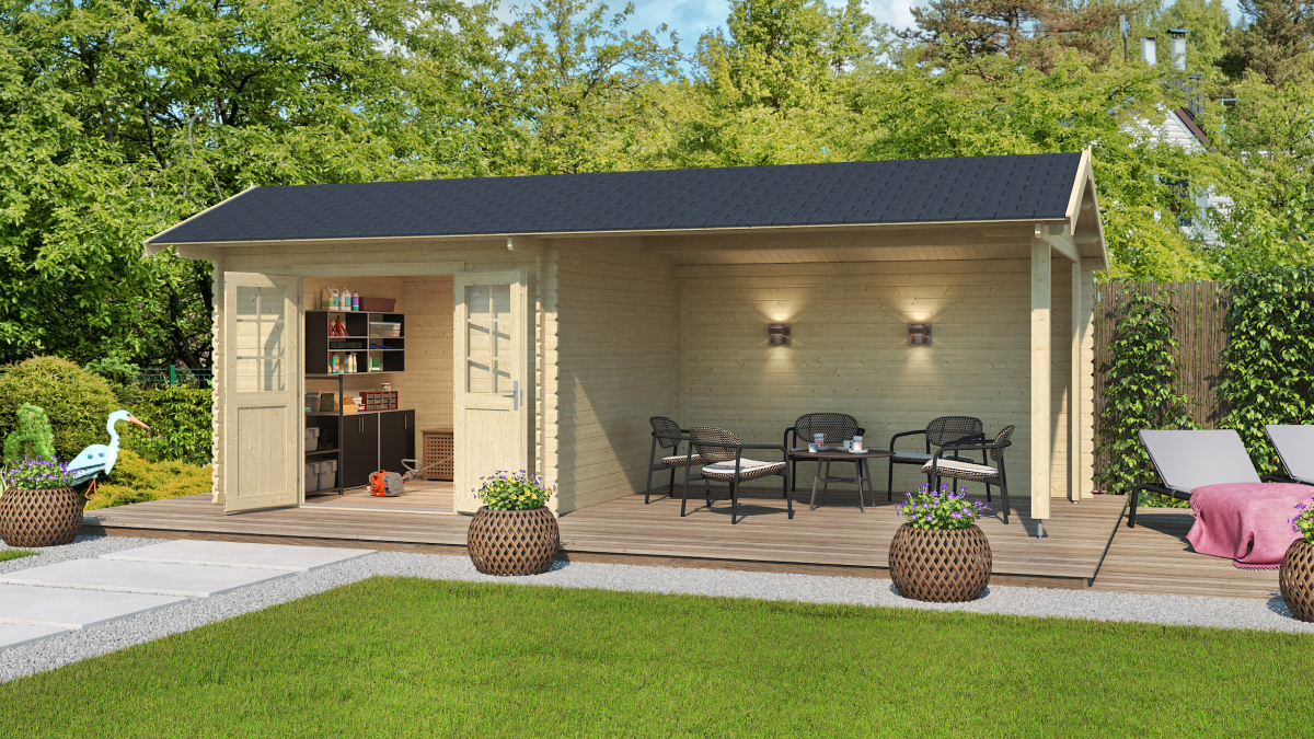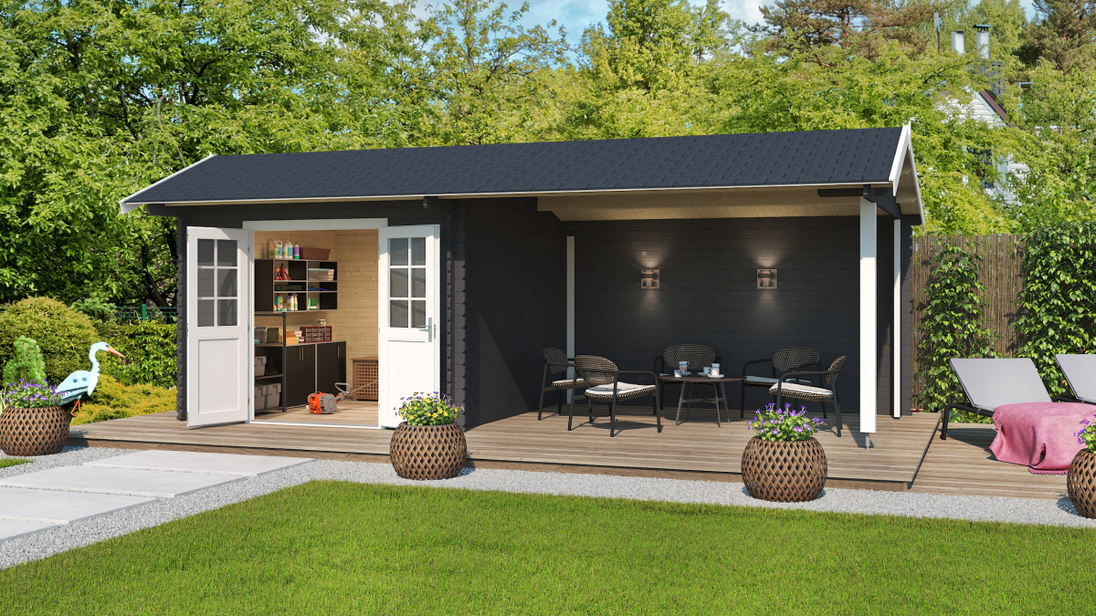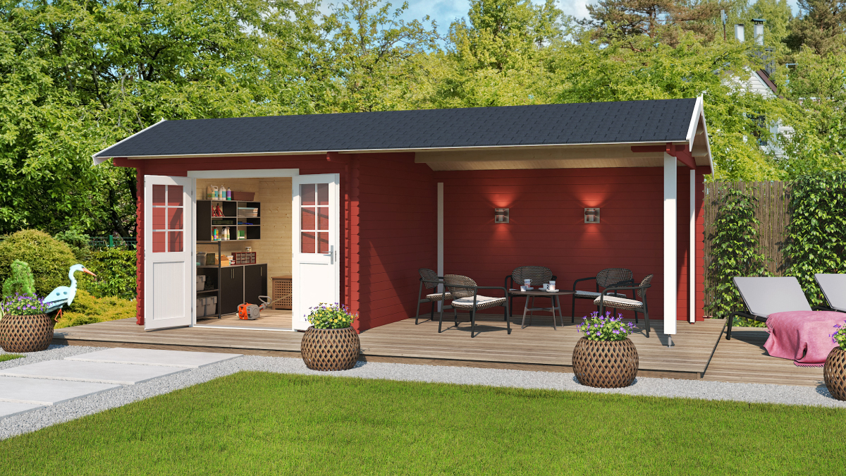 Blog 9: Gartenhaus mit Überdachung St. Louis ist derzeit die beliebteste Gartenhausvariante für Einfamilienhäuser. Es bietet nicht nur Stauraum für Gartenutensilien, sondern auch Platz für Entspannung oder gemütliches Beisammensein.