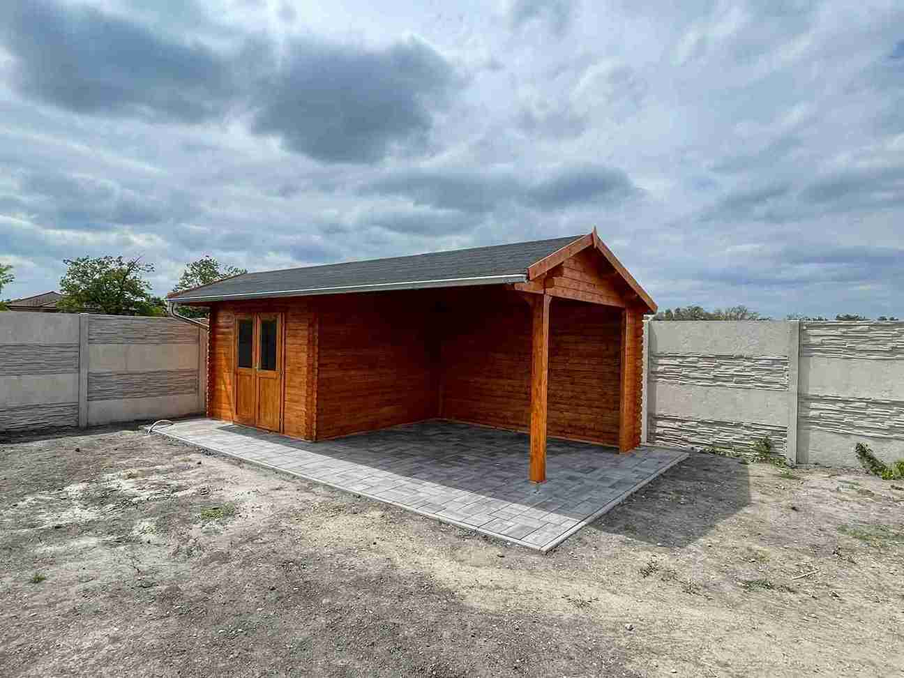 Sie können verschiedene Arten und Farben von Pflastersteinen wählen. Scheuen Sie sich nicht zu experimentieren – unsere Kunden haben sich bei der Hütte Novia 275 Plus für eine sehr schöne braune Pflasterfarbe entschieden. Wie Sie auf dem beigefügten Foto sehen können – passt diese Farbe perfekt zum Charakter dieses Gartenhauses.
