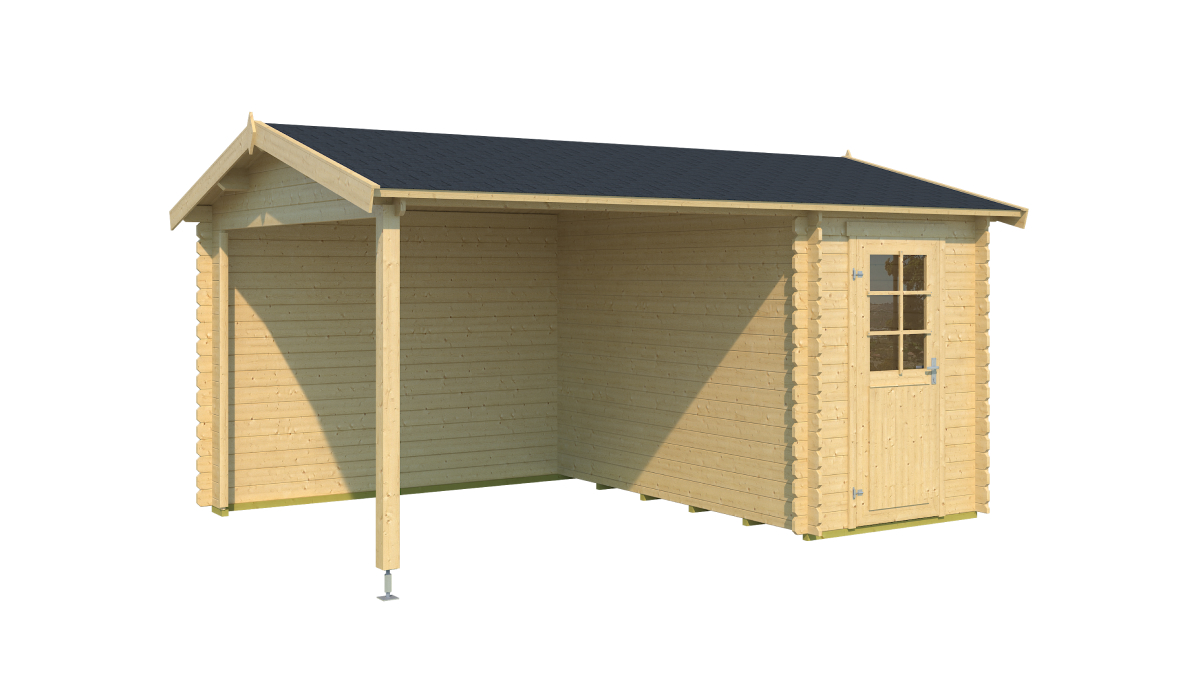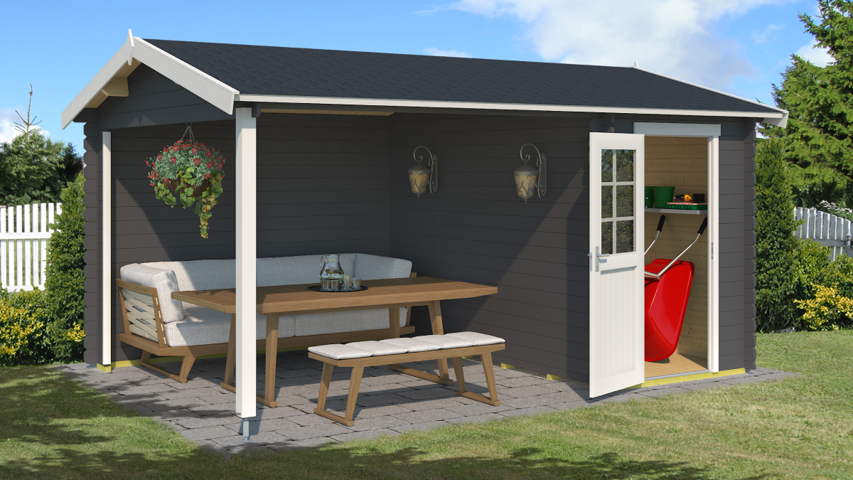 Praktische Gartenhütte mit großer überdachter Terrasse – ein idealer Sommertyp für Frühling, Sommer und Herbst. Die Grundidee dieser Hütte stammt von einem Modell ohne Geräteraum. Auf Kundenwunsch wurde die Gartenhütte mit dieser Anpassung realisiert.