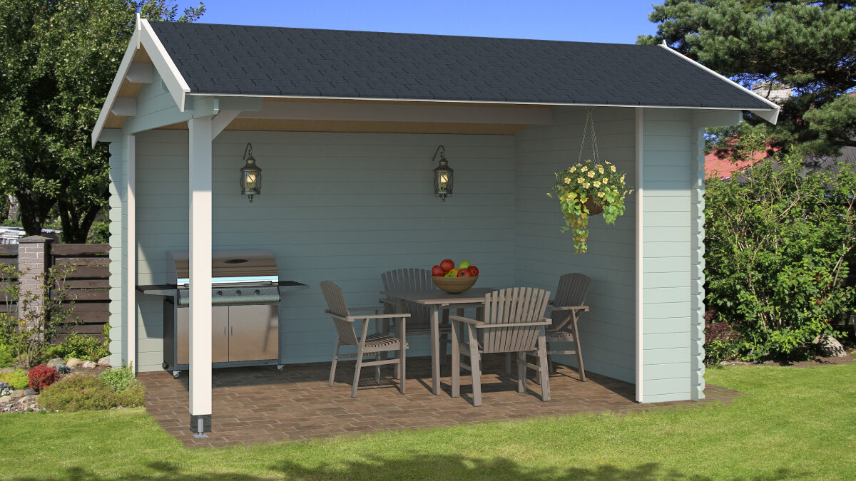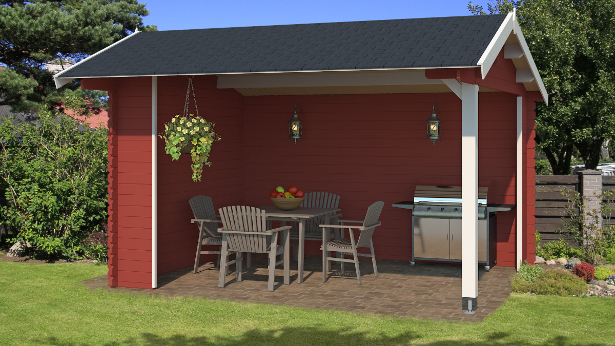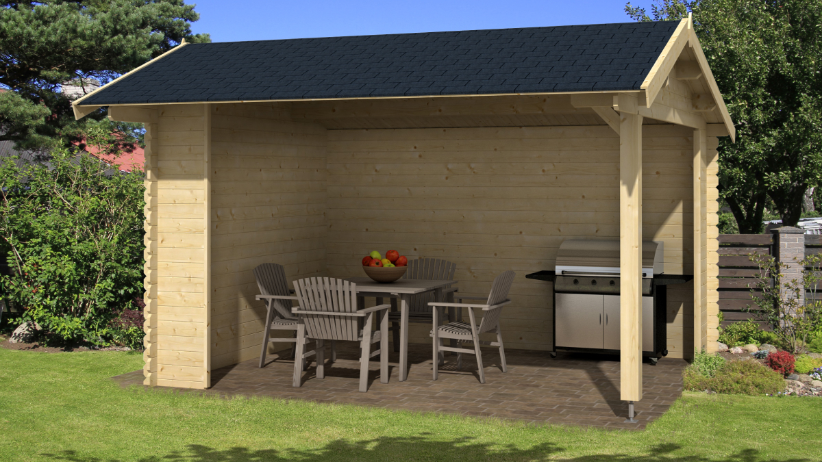 Der Gartenunterstand Kirian ist eine Ergänzungsstruktur zu unserem Standardsortiment an Gartenhäusern. Er bietet dem Kunden 11,4 m² Fläche, die sich für das Sitzen im Freien, die Lagerung von Holz oder das Abstellen eines Rasenmähers eignet. Er wird aus vorgetrocknetem nordischem Fichtenholz gefertigt. Für die Montage empfehlen wir Pflastersteine, die einen festen, stabilen und vor allem ästhetischen Untergrund für den Gartenunterstand bieten. Der Gartenunterstand kann auch in einer spiegelverkehrten Ausführung montiert werden.