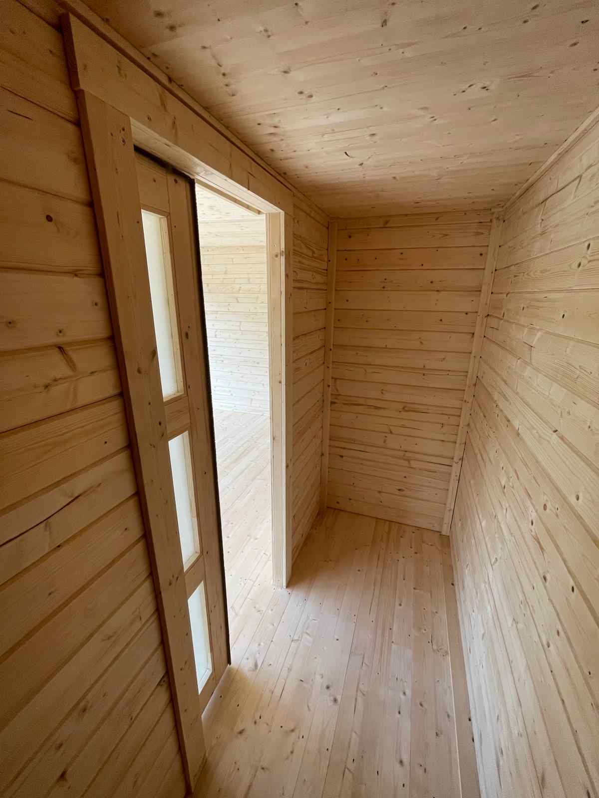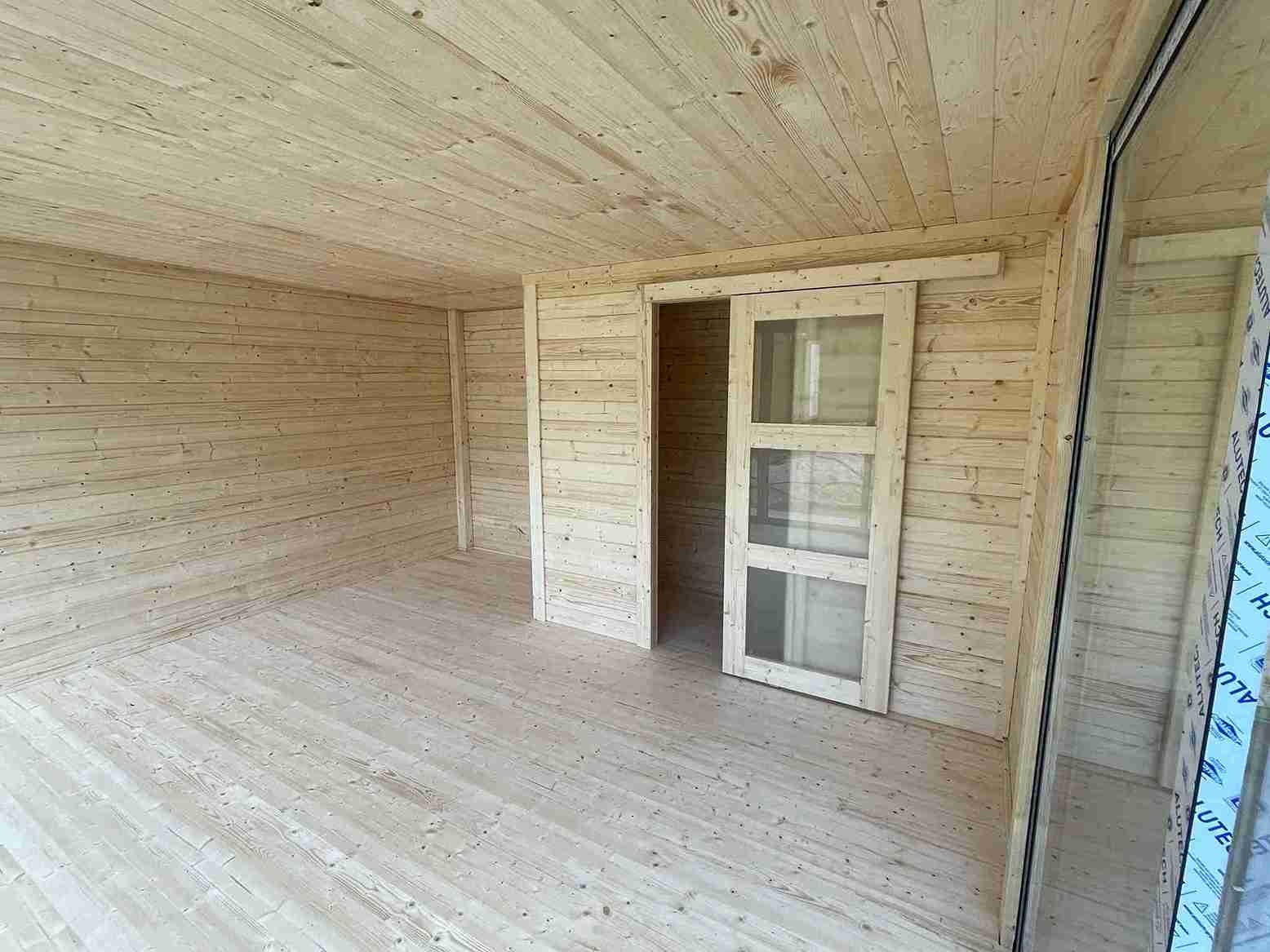 Das moderne Holz-Gartenhaus Domeo 4 ist die ideale Lösung für diejenigen, die ein modernes, geräumiges und lichtdurchflutetes Holzhaus suchen. Mit großen Glasflächen und einer hochwertigen Holzstruktur eignet es sich hervorragend für den Einsatz als Büro, Wellnessbereich oder Erholungsraum im Garten.