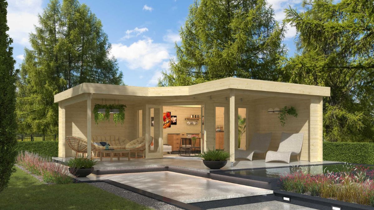 Braunschweig ist ein luxuriöses Gartenhaus in L-Form, ideal für Entspannung im Freien oder die Zubereitung von Mahlzeiten in der Natur. Sein durchdachtes Design und die hochwertige Konstruktion machen es zu einer perfekten Ergänzung für jeden Garten.