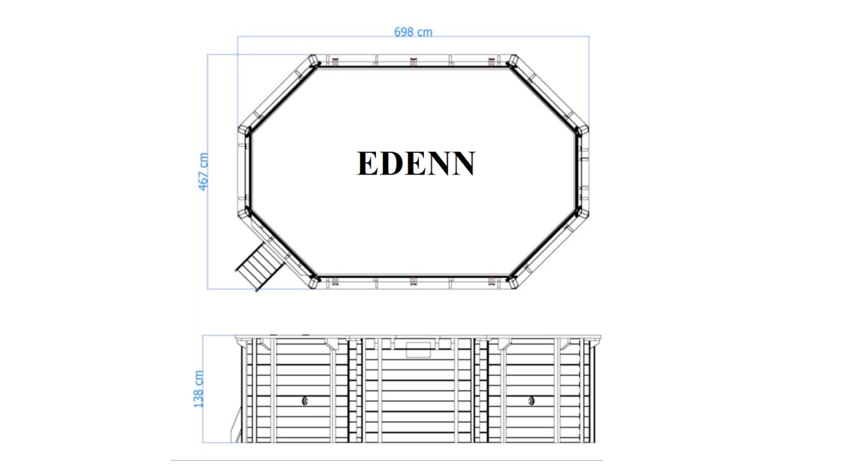 Der Pool kann gleichzeitig von mehreren Personen für Freizeitschwimmen genutzt werden. Am Abend genießen Sie darin die beste Sommerpoolparty. Der montierte Pool Edenn kann in Ihrem Garten, Ferienhaus oder natürlich als Familienbad neben Ihrem Haus stehen. Er passt wunderschön zu unseren Gartenhäusern und Gartenhütten. Auch die Installation ist einfach. Sie brauchen sich wirklich nicht davor zu fürchten. Jeder Heimwerker kann sie mit einfachem Werkzeug bewältigen. Falls nötig, kann der Pool demontiert und an einen anderen Ort verlegt werden.